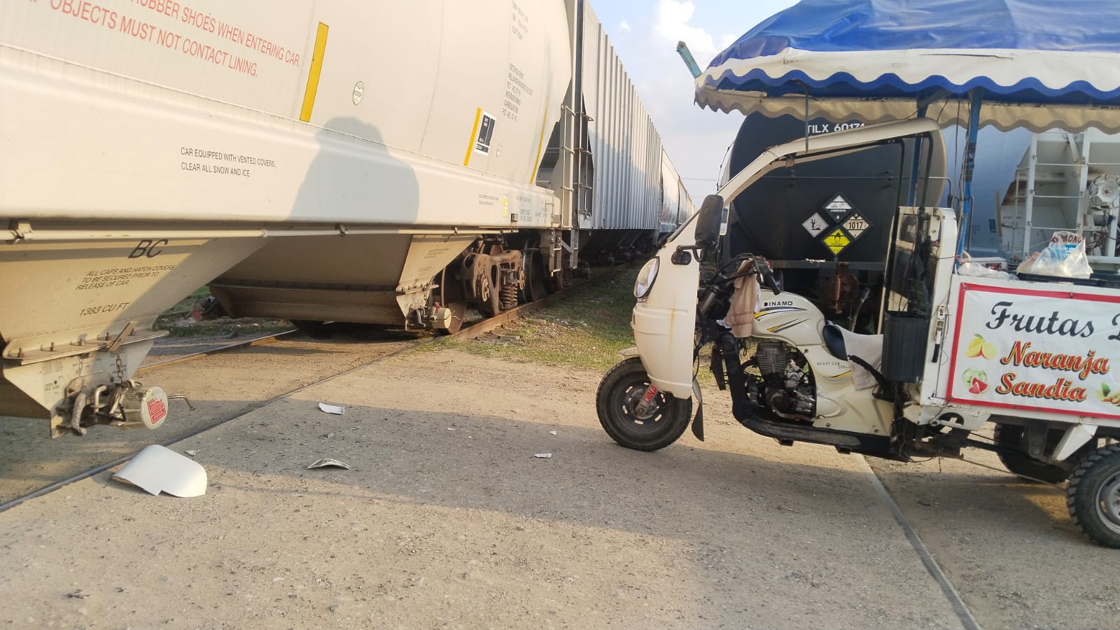 De acuerdo a lo informado por la autoridad vial, el conductor de la moto camioneta de la marca Dinamo, tipo Heavy, se desplazaba de oriente a poniente y al intentar pasar las vías férreas, es impactado por el tren de carga, el cual metros adelante detuvo su marcha.